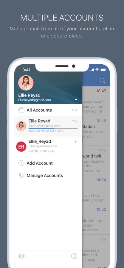 All Accounts in One—Manage emails from Gmail, Google Apps, Outlook, Office 360, Yahoo! Mail, AOL, iCloud or any other IMAP server.