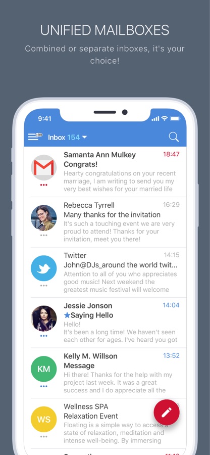 Unified Experience—Combine emails from all of your accounts into a unified mailbox or view each account separately.