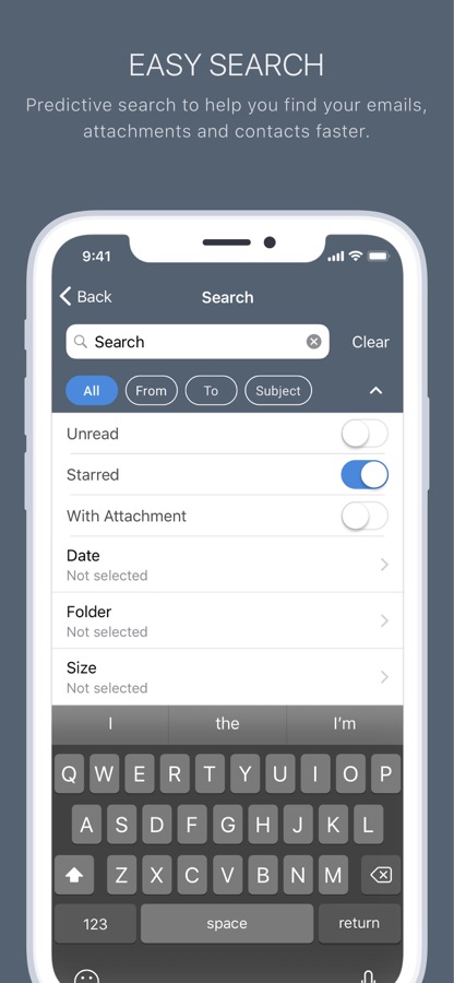 Smart Search—Powerful predictive search allows you to find any email, contact or attachment quickly and accurately from all accounts whether it’s stored locally or on the server.