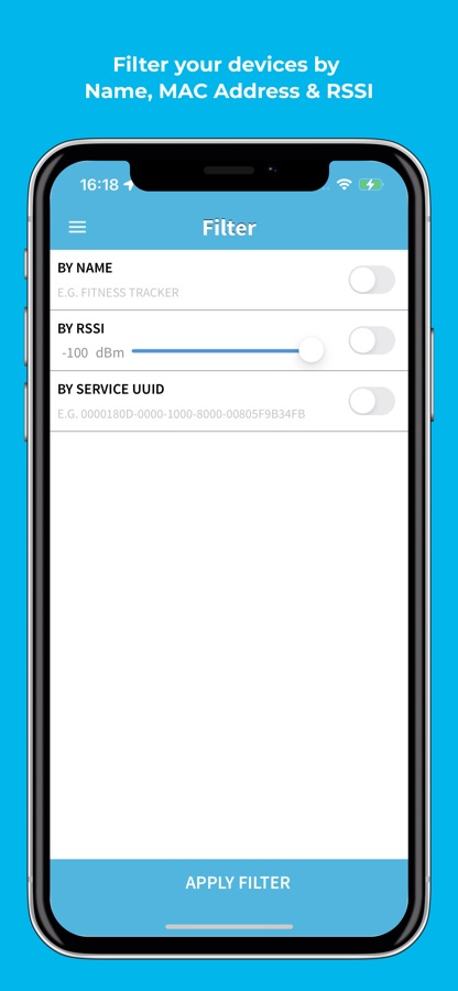 — Instant Discovery: Quickly find nearby BLE devices with real-time signal strength (RSSI). Lower the number the closer you are to the source i.e. -25 is very near and -80 is far from your BLE devices.