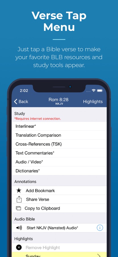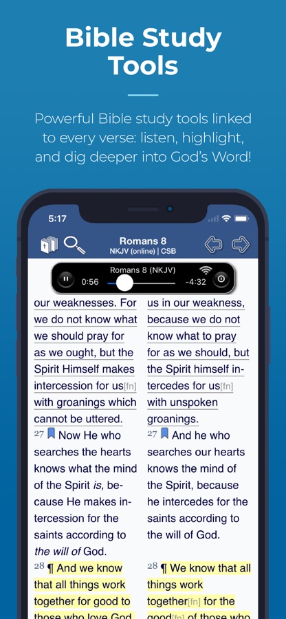 Dig deep into God’s Word with over 30 Bible versions, audio Bibles, text and audio commentaries, Hebrew / Greek lexicon, concordances, dictionaries, advanced word searches, and more. Customize your reading experience with rich color themes, fonts, auto scrolling, and parallel version views. Personalize your study with highlighting, underlining, and note taking options – all with Cloud back up.