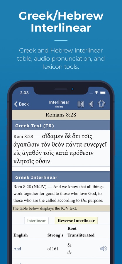 • Choose from over 30 Bible translations available in English, Spanish, Chinese, Korean, German, Russian, French, Hebrew, and Greek