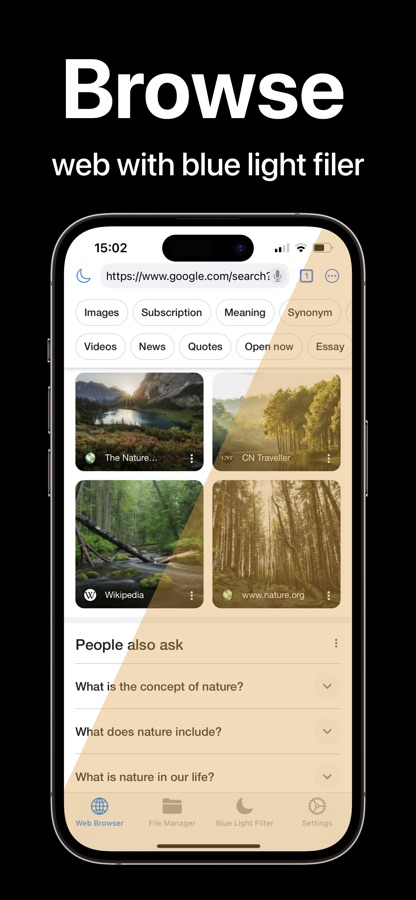 Blue Light Filter is your all-in-one solution for a comfortable and productive digital experience on iOS. Equip your device with our adjustable blue light filter to alleviate eye strain and improve sleep quality, especially during nighttime browsing and reading. Effortlessly manage and organize your documents, photos, and videos with our intuitive file manager, featuring zip/unzip support. Enjoy a seamless web browsing experience with an integrated blue light filter and easy access to bookmarks and history. Designed with a user-friendly interface, the app ensures easy navigation for users of all ages, and is fully optimized for iOS with Dark Mode compatibility, haptic feedback, and quick actions via 3D Touch. Download Blue Light Filter today and transform your screen time into a safer, more comfortable, and more efficient experience.