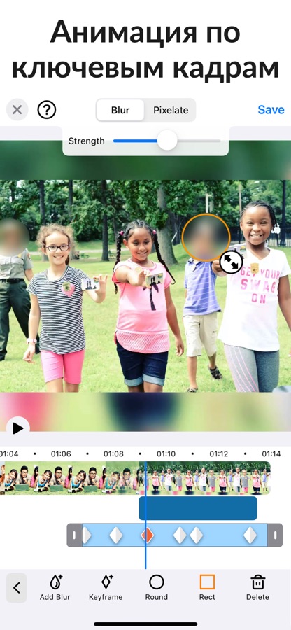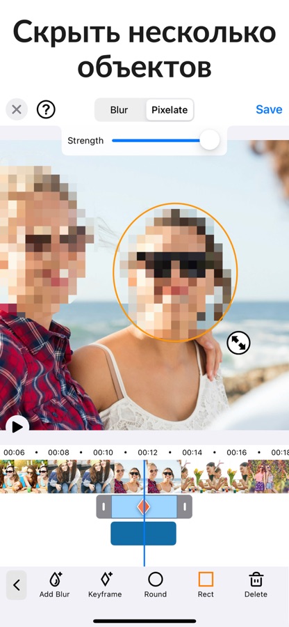 В отличие от других приложений, вы можете определить более 1 области для размытия / пикселизации, используя эллиптические или прямоугольные формы со смещением, чтобы вы могли легко размывать касанием пальца. Определите продолжительность каждой области размытия и отрегулируйте интенсивность.