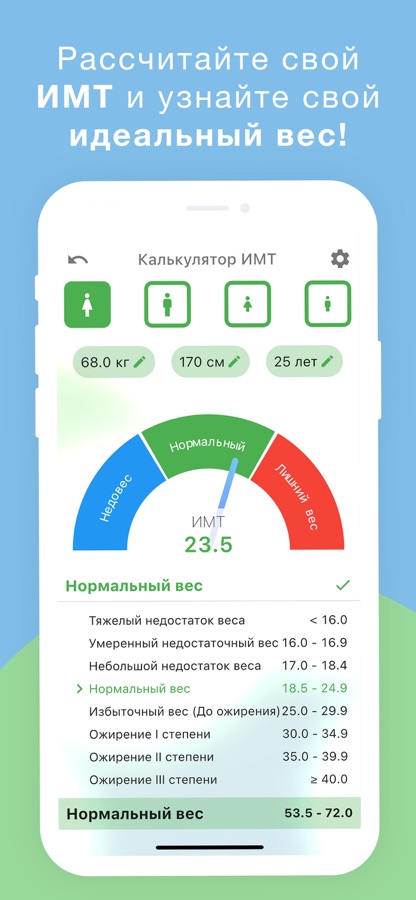 Скачайте приложение Калькулятор ИМТ: идеальный вес для iOS бесплатно - последняя версия (1.5.8) уже доступна для установки на ваш iPhone или iPad.