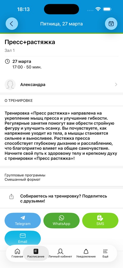 Всё, что нужно для комфортных тренировок, в одном приложении. Расписание, уведомления, личный кабинет и специальные предложения — без звонков и очередей на ресепшен.