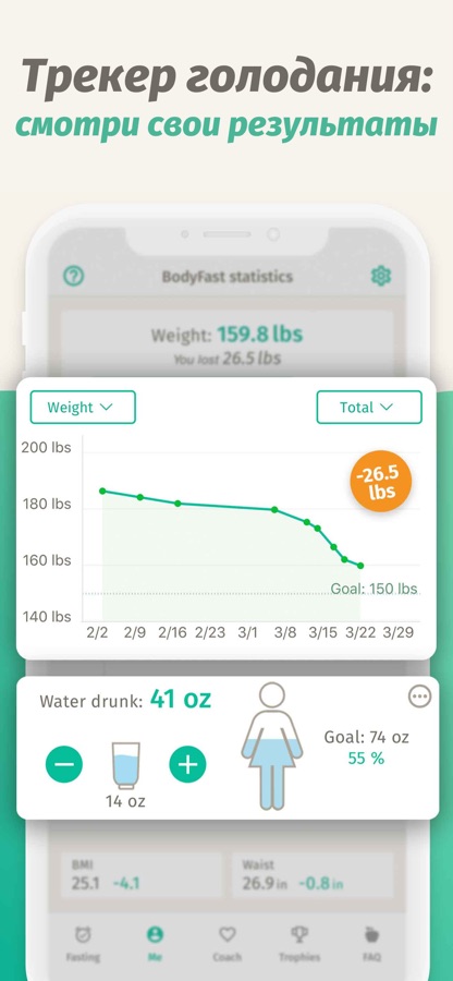 BodyFast сопровождает вас день за днем на пути к вашим целям. Достигайте своей цели по весу, становитесь здоровыми и чувствуйте себя полными энергии.
