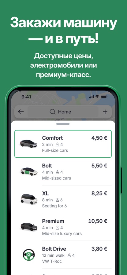 Bolt – отличная альтернатива такси: это быстрый заказ поездки, комфортабельный сервис и доступные цены. Широкий спектр услуг, от повседневных поездок по делам или по работе до трансферов в путешествии. Собираетесь в путь? Выбирайте Bolt!