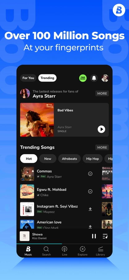 Boomplay music player boasts more than 100M songs which include the new music and podcasts. Come and search for your favourite songs, artist, or podcasts.