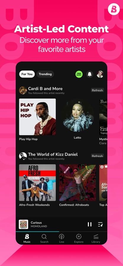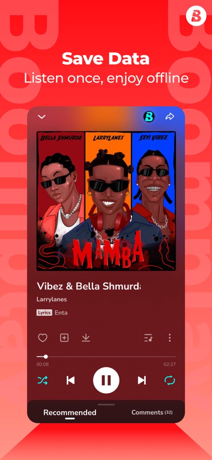 Boomplay music app is a music player with over 100M songs across different genres like Pop music, Rock, Afrobeats, Afropop and Reggae from top artists. Stream and download music including the best new songs, albums and curated playlists on Boomplay for free and play music offline data-free!
