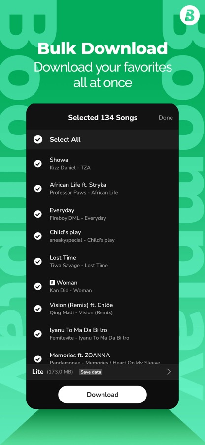 Boomplay music downloader allows you to play your favourite songs offline. You can also use Boomplay as a media player to play all your local music offline like MP3s, AAC, M4A, WAV, and other files from the local files from your SD card or phone.