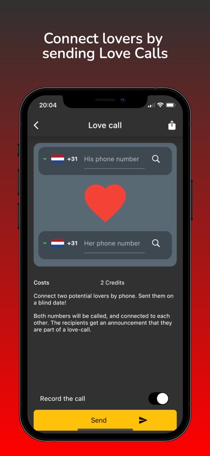 — Send love calls: Connect two love-birds to each other by entering their phone numbers.