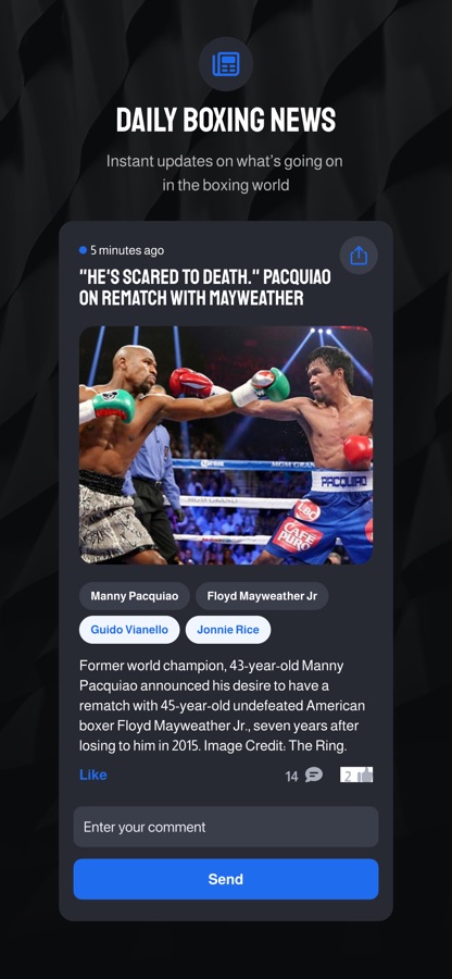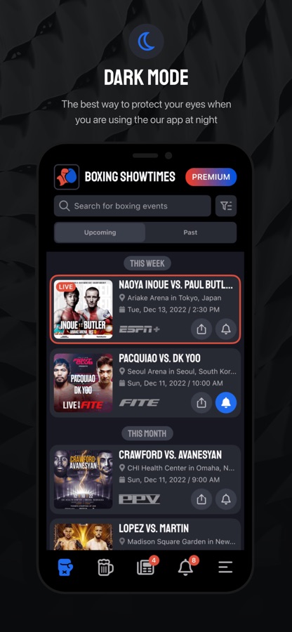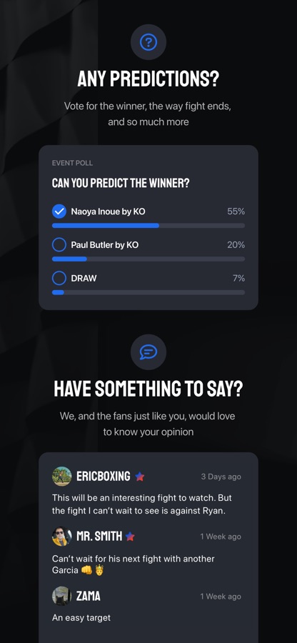 Stay connected to every fight, follow your favorite fighters, and experience boxing with fans around the world. Built by fans, for fans — Boxing Showtimes is your boxing community!
