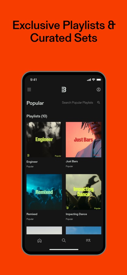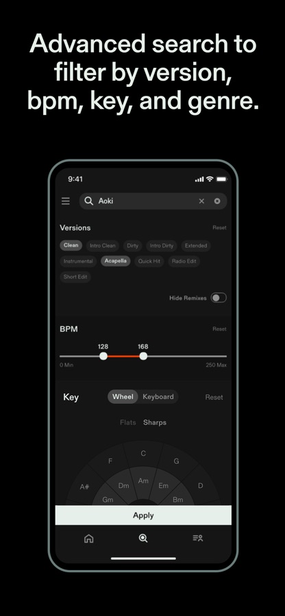 • Advanced Search with artists, songs, albums, playlists, curated sets results and filter by version, bpm, key, genre