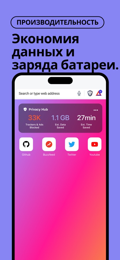 Brave ускоряет загрузку страниц, повышает производительность и защищает от вредоносной рекламы. С Brave веб-серфинг в iOS становится в 2-4 раза быстрее, так что вы сразу заметите — ваше устройство будет потреблять меньше трафика и сможет дольше работать от батареи.