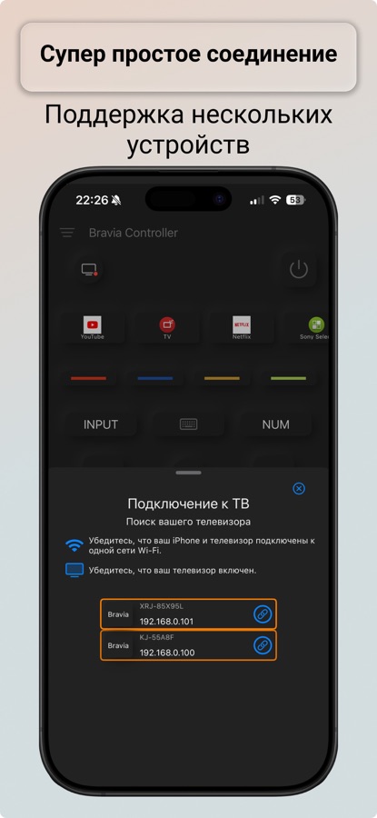 Bravia Controller — это приложение, которое позволяет управлять телевизором Sony BRAVIA через локальную Wi-Fi сеть.