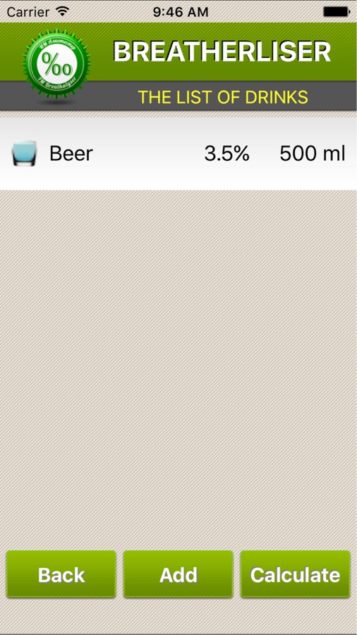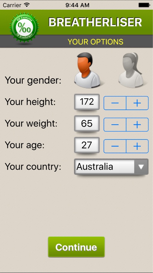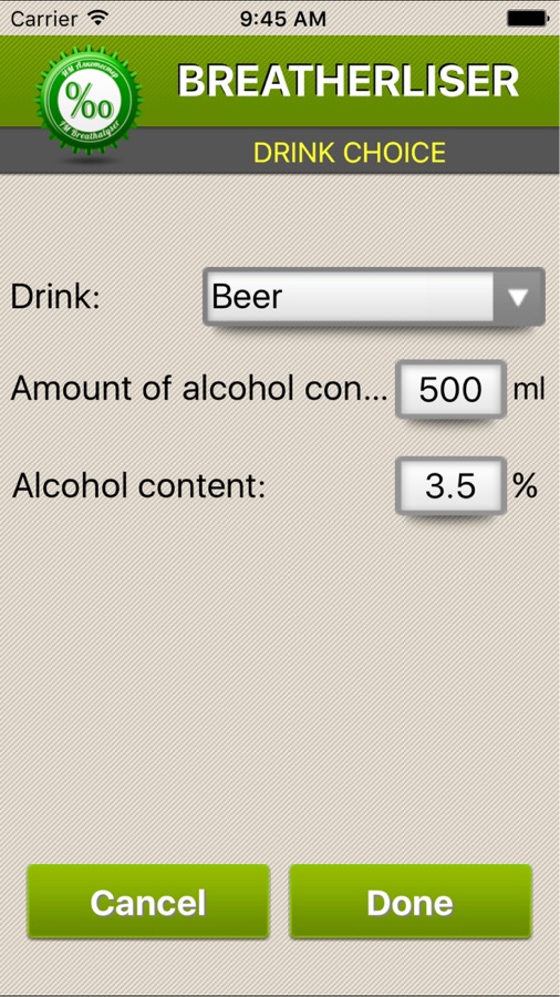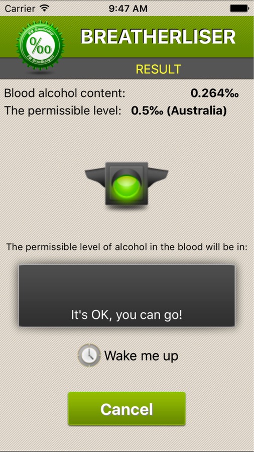 В отличие от настоящих алкотестеров, наше приложение не предоставляет достоверных результатов по концентрации алкоголя в крови. После ввода определенных параметров человека (пол, рост, вес, возраст и количество и тип предполагаемого спиртного напитка) вы сможете представить, через какое возможное время результаты на содержание алкоголя в крови могли бы считаться соответствующими или нет для вождения автомобиля в отдельно взятой стране.