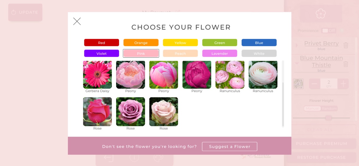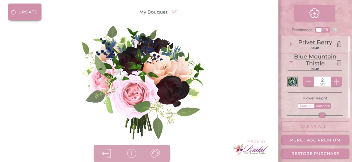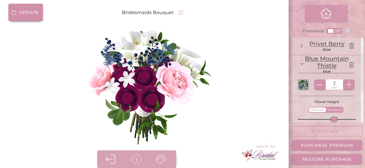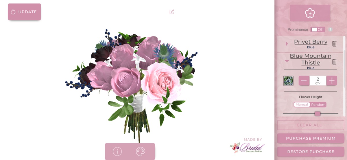 Start by choosing your dress color. Then, hop in the app and choose your flowers and foliage. Change the color or variety of flowers with a click and then generate a new bouquet by hitting the Update button. You will be able to rotate your bouquet, so you can see if from every angle.