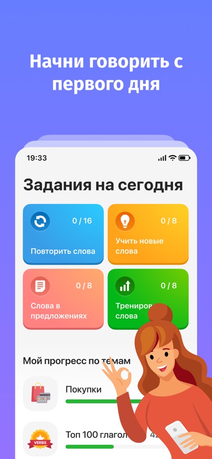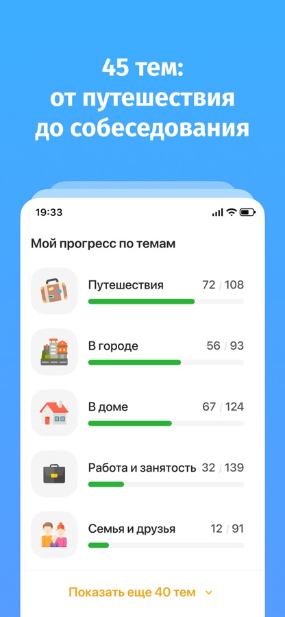 • 45 уникальных тематических наборов для каждого уровня сложности составлены и озвучены носителями языка. Путешествия и жизнь в городе, семья и друзья, работа и сленг — изучай живой, а не книжный английский.