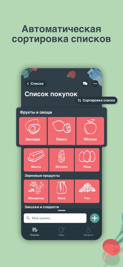 — Сортируйте категории продуктов в списке покупок по рядам в супермаркете.