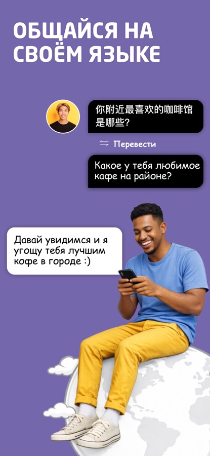 Встроенный переводчик помогает общаться на разных языках, так что можно знакомиться и ходить на свидания без границ.