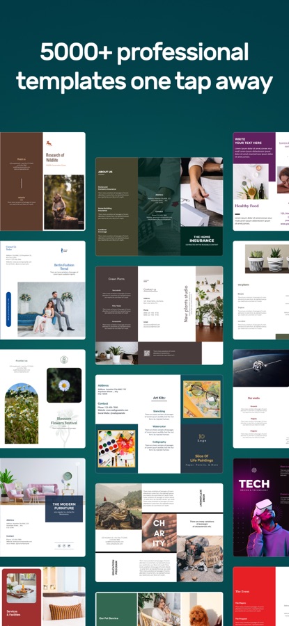 Brochure Maker & Tri-Fold Brochure Design App предлагает более 5000 готовых шаблонов брошюр для вашего бизнеса, услуг, мероприятий, продуктов, личных проектов и других нужд.