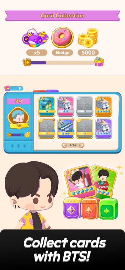 Play match-3 puzzles on [BTS Island: In the SEOM] and explore the island with the BTS members (RM, Jin, SUGA, j-hope, Jimin, V, Jung Kook). Listen to BTS songs while you play match-3 puzzles on this relaxing island.