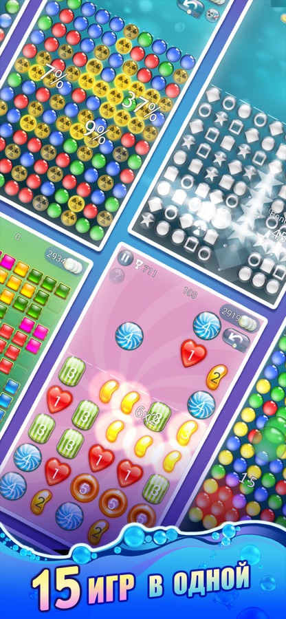 — 15 режимов игры: Классический, Стрелялочка, Нашествие, Расслабуха, Гравитация, Критическая и игра против компьютера, Степерь двойки и Сваппер