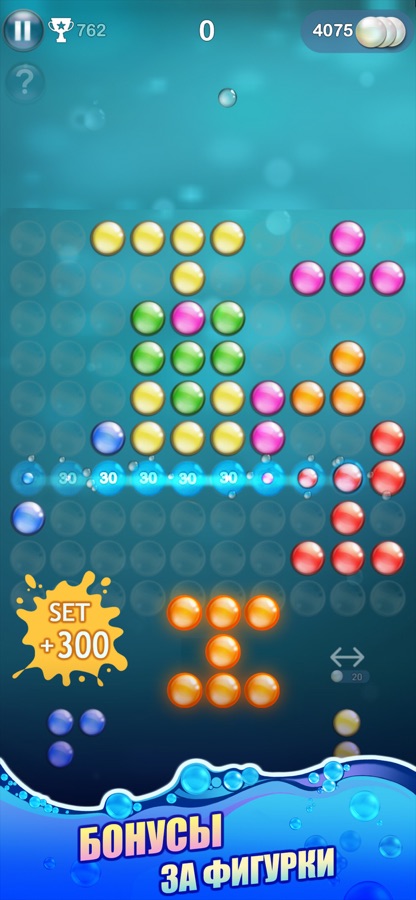 — БОНУСЫ за взрывы групп пузырьков правильных форм: квадратов, линий, уголков, и т.д…