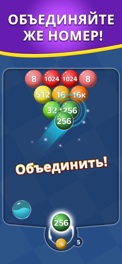 Просто проведите пальцами слияния число пузырьки. 1024, 2048, 4096, 8K, 16K… Стрелять пузыри и слияния число. Вызов рекорды, чтобы расслабиться.