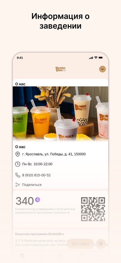 В приложении «BubbleBro» вы можете посмотреть актуальное меню, адреса чайных, количество баллов и персональные предложения по карте лояльности, оставить отзыв и получить обратную связь от менеджера, сделать заказ для самовывоза или оформить доставку.