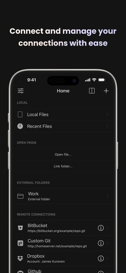 • Connect to GitHub, GitLab, BitBucket, Custom Git, Dropbox, iCloud, Google Drive, SFTP, SSH, and FTP servers