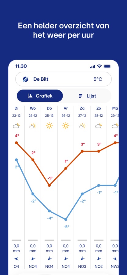 In de “Verwachting” tab kan je in een grafiek voor de komende 14 dagen de weersverwachting bekijken. Dit kan je ook weergeven in een lijst: een verwachting van uur tot uur, voor de komende 7 dagen gedetailleerd, en een gemiddelde voor de 7 dagen erna.