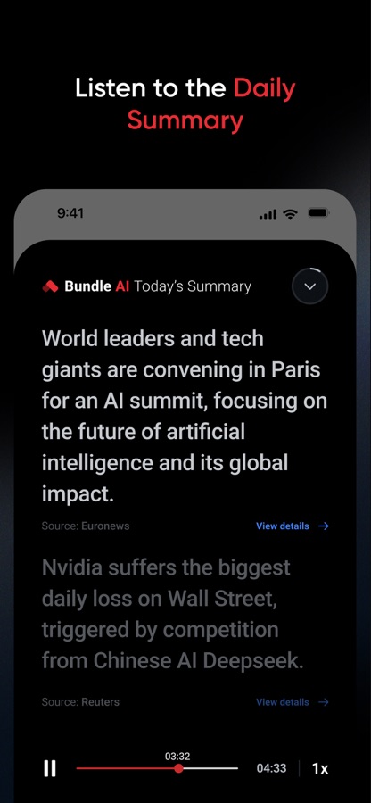 • Breaking news – With Bundle, you receive instant notifications for the day’s most important developments and standout headlines, ensuring you stay informed before anyone else in a refined, accurate, and unbiased manner.