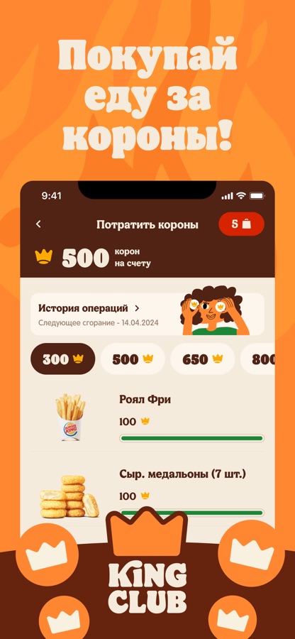 Ешь как Король – пользуйся привилегиями бонусной программы King club. Получай короны за каждый заказ, копи их и меняй на любимые блюда в Магазине корон.