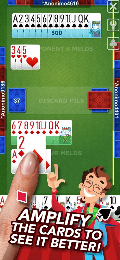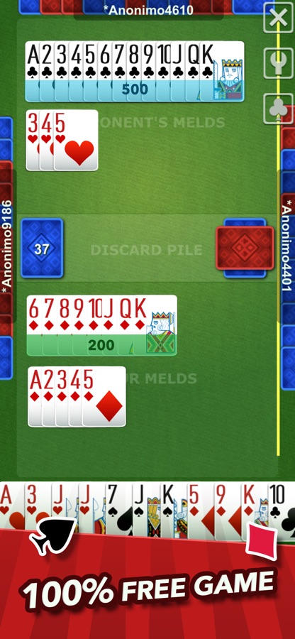 To make a meld: A meld is formed by 3 or more cards of the same suit, arranged in numerical sequence. The sequence goes from the 2 to the King (K). You can put the Ace (A) before the 2 or after the King. During the game you can add more cards to the meld.
