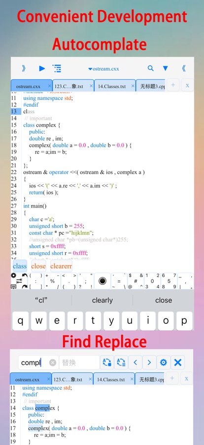 (^.^) Enjoy code templates, autocomplate, auto-indentation, code coloring, symbol completion, a symbol keyboard, text search, multi-file search, multi-line indentation, multi-line comments, code formatting, making development more convenient.