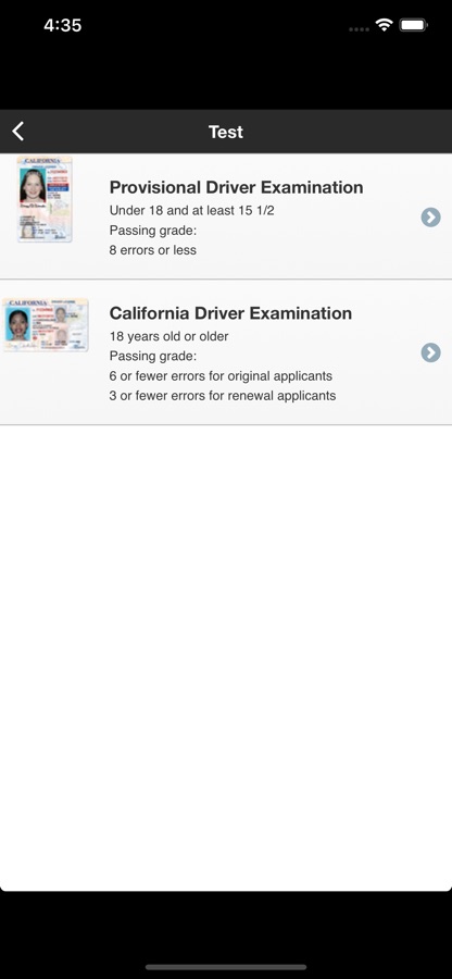 If you are 18 years old or older, you should take California Driver examination. There are 36 questions on the exam. Passing grade: 6 or fewer errors for original applicants, 3 or fewer errors for renewal applicants.