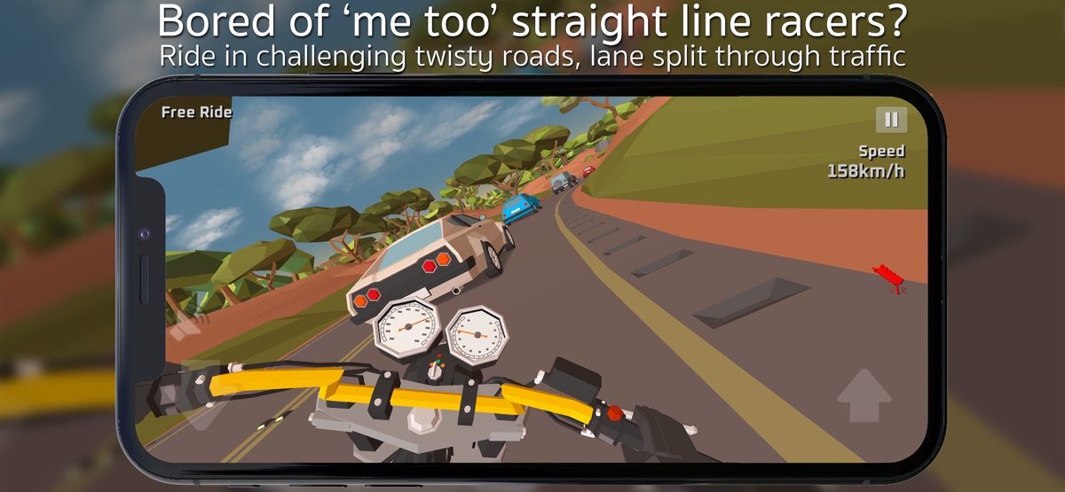 Get on your bike and choose your own pace, from a leisurely ride to frantic high speed racing, skillfully swerving and filtering through realistically moving traffic. Choose between one or two way traffic, multi or single lane roads, ride through cities, forests, country roads and desert environments. All in glorious Low-Poly lack of detail.