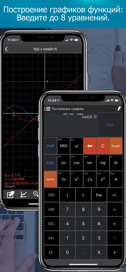 • Построение графиков функций: Введите до 8 уравнений. Дополнительные функции при построении графиков функции: построение нескольких графиков одновременно, нахождение точек на графике и показ касательных к графику.