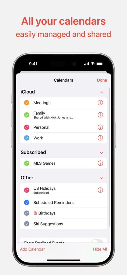 Просматривайте все свои события из различных календарей на одном экране приложения «Календарь». Подключайте календари из iCloud, Exchange, Google и других учетных записей. Обозначайте события из различных календарей разными цветами. И просматривайте все свои события вместе в режиме «Список», «День», «Неделя» или «Месяц».