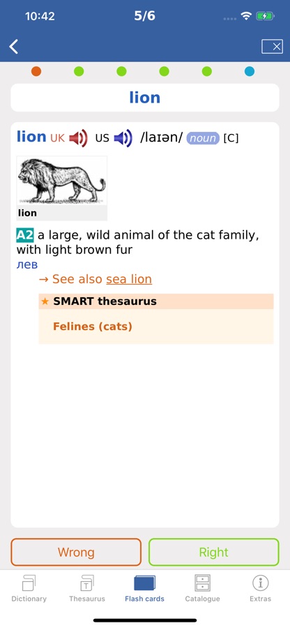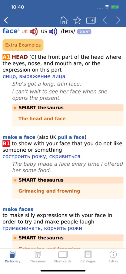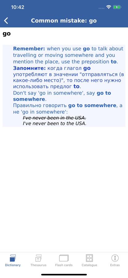 • Дополнительные функции приложения позволяют проверить свои знания с помощью теста по карточкам, добавлять слова в Избранное, а также сохранять историю поиска слов.