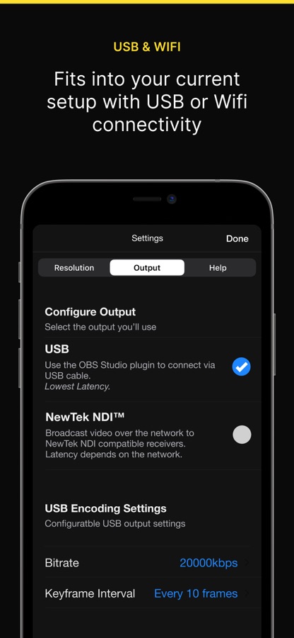 Choose the connection type. If you want low latency, use USB, if you’d like portability then use WiFi. WiFi is done using the NewTek™ NDI® protocol, so you can use Camera for OBS Studio with any NewTek™ NDI® compatible receiver.