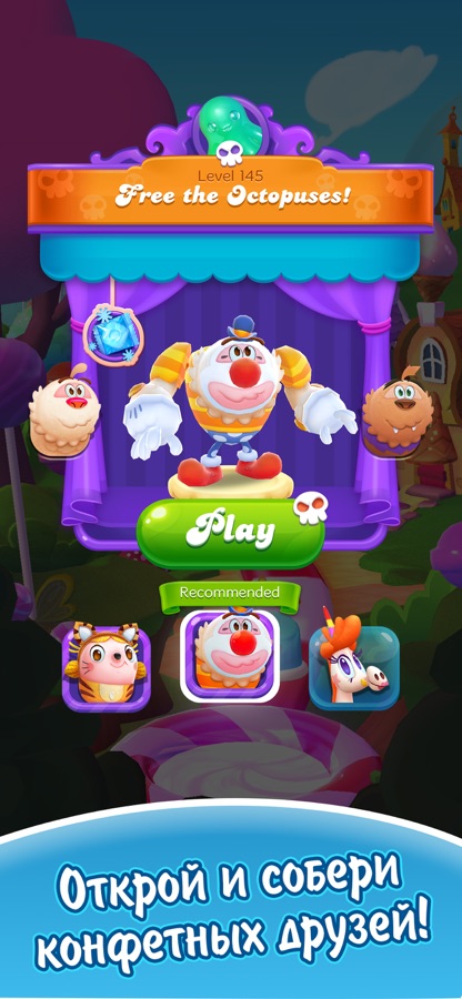 Новейшая игра из серии Candy Crush! Вас ждут обновленная графика, невиданные раньше веселые режимы игры и ватага друзей, готовых помочь вам пройти сотни уровней!