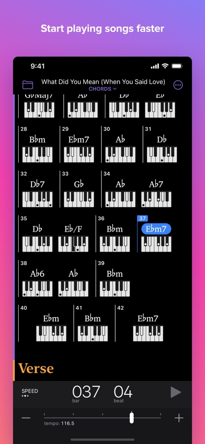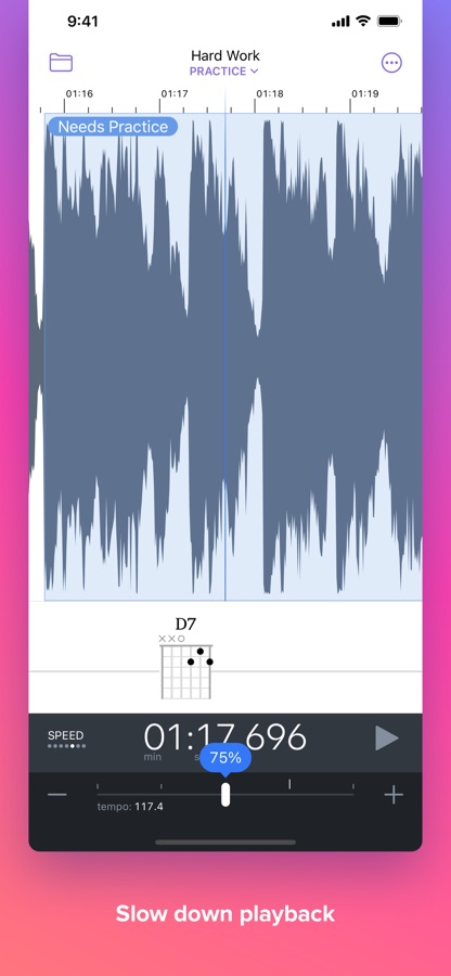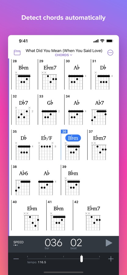 Capo automatically detects chords, beats, and the key of songs to get you started. Change, add, or remove the detected chords easily with a few taps as you identify alternate chords and voicings. Use Capo’s structure song view to edit Capo’s beat grid for songs with changing, or uncommon time signatures.