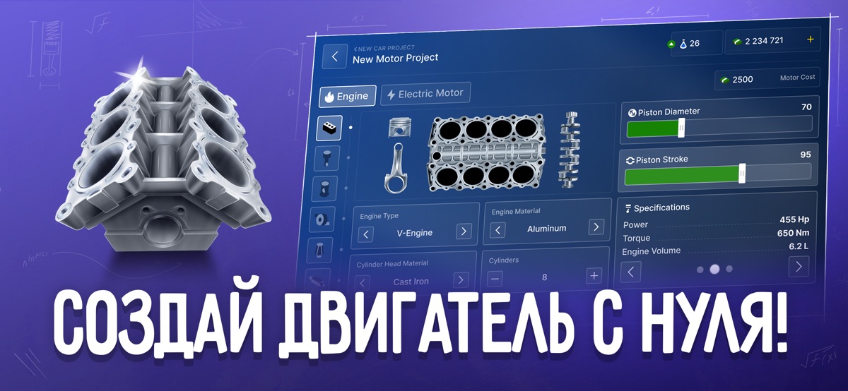Сконструируйте мощный V12 или экономичный 4-цилиндровый мотор. Настраивайте диаметр и ход поршня, экспериментируйте с турбонаддувом, распредвалами, охлаждением и выхлопом. Выбирайте материал двигателя, шатуны и другие детали. Более сотни элементов кастомизации помогут построить идеальный двигатель!