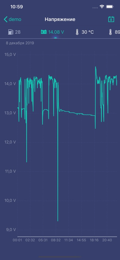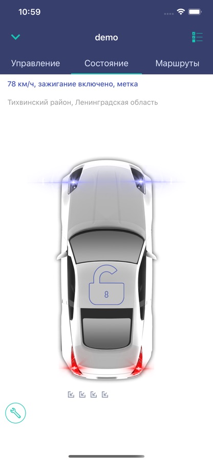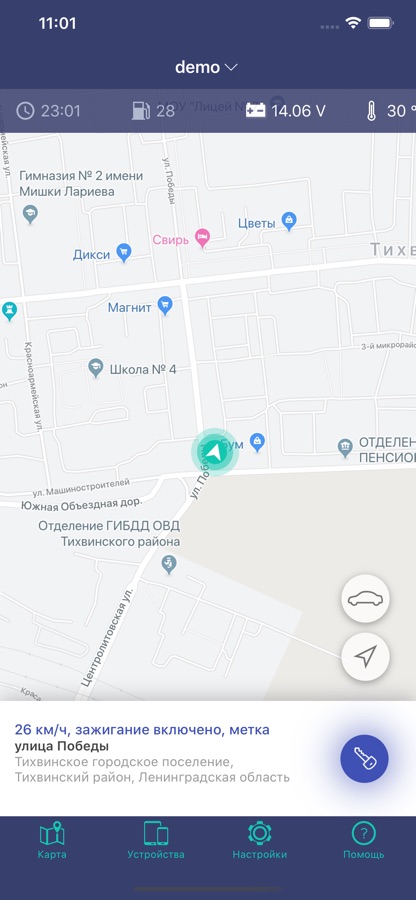— Слайд-бар с основными статусами системы: время передачи данных, заряд АКБ/встроенного элемента питания, температура, баланс SIM-карты, количество спутников GPS/ГЛОНАСС, заряд батарейки в метке