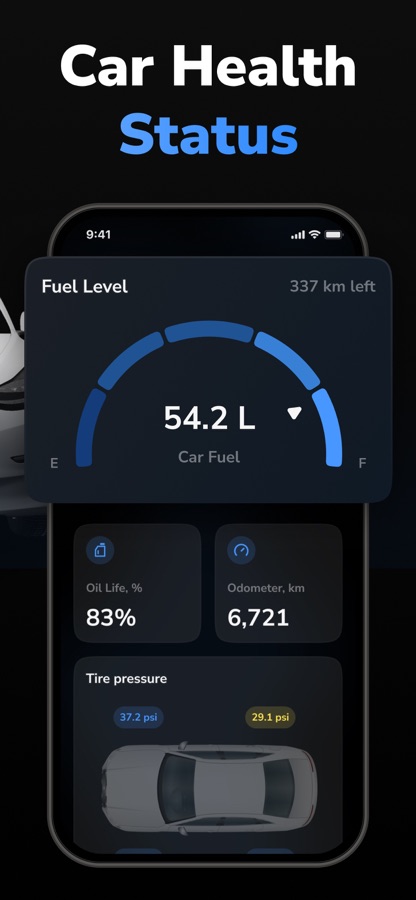 • Real-Time Vehicle Health: Fuel, tire pressure, oil life—track it all instantly to keep your car running at its best, always.