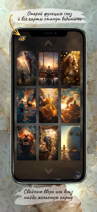 Используйте функцию «открытого глаза» для работы с картами в разных режимах (с закрытыми и открытыми картами). Простые ответы на вопросы типа «Что меня ждет сегодня?» или глубинные путешествия — все это доступно вам. Чем насыщеннее вопрос, тем интереснее и необычнее будет ответ.