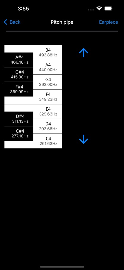 ● Pitch pipe : Produces a mathematically accurately calculated frequency tone. Also, the piano keyboard interface and standard frequency values can help you understand sounds and music.